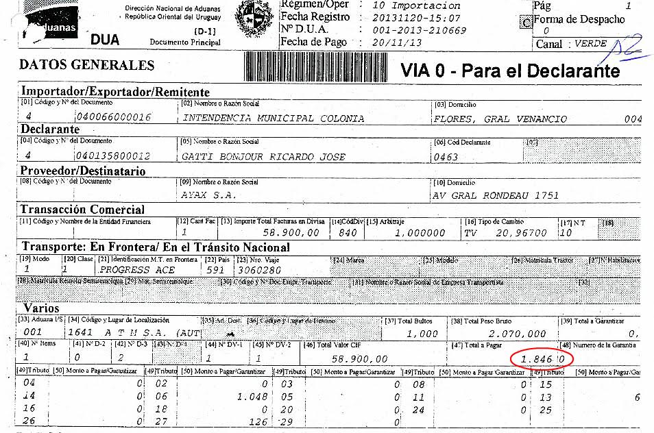 De acuerdo a la lectura del expediente que hicimos en EL ECO, el cual fue enviado por la intendencia a los ediles que llevaron este tema a la justicia, figura el DUA (Documento Unico Aduanero) que permite establecer los impuestos y/o exoneraciones que tiene un producto de importación (Ver documento en esta misma página).