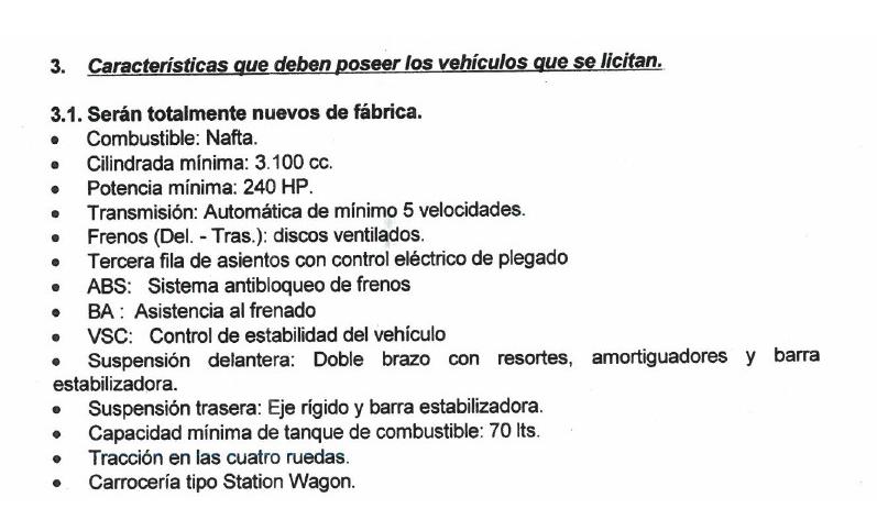 El secreto aparece en el punto 3 del llamado a Licitación que se titula “Características que deben poseer los vehículos que se licitan”. Allí se señalan las características normales de muchas camionetas de alta gama, como por ejemplo que sea a nafta, que tenga una gran cilindrada, especificamente 3.100 c.c, una potencia mínima de 240 HP, trasmisión automática, cinco velocidades, freno ABS. En fin, hasta ahí había muchas camionetas en plaza con esas características.