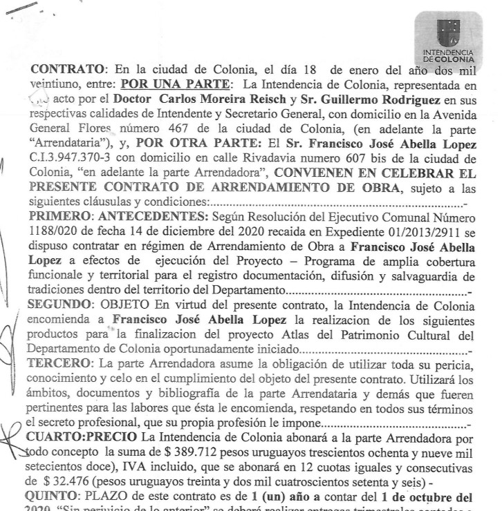 Otro caso de contratos prolongados con la intendencia de Colonia es el caso del periodista Francisco José Abella Lopez a quién la intendencia contrató en 2019 para el “Programa de Amplia cobertura funcional y territorial para el registro, documentación, difusión y salvaguarda de tradiciones dentro del territorio del departamento”. Tras este pomposo nombre se encuentra un trabajo de recopilación histórica y entrevistas a figuras de diferentes ciudades. El contrato es de $389.712 pagaderos en 12 cuotas de $32.476. por un año a partir de octubre de 2020.